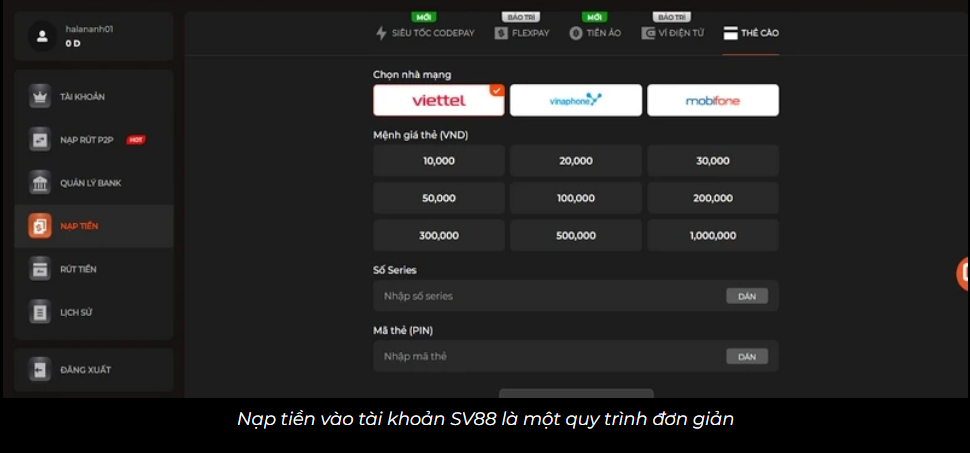 Nạp tiền SV88 siêu nhanh tài khoản sáng đèn chỉ sau vài chạm