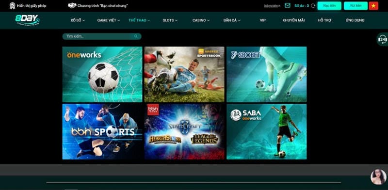 Điểm nổi bật của Nhà Cái 8day nằm ở cách tổ chức hệ thống gọn gàng và dễ sử dụng. Các danh mục trò chơi được phân chia rõ ràng, thông tin kèo cược và tỷ lệ hiển thị minh bạch, giúp người chơi dễ dàng theo dõi và đưa ra lựa chọn phù hợp. Điều này đặc biệt hữu ích với người mới, khi chưa có nhiều kinh nghiệm trong cá cược trực tuyến.